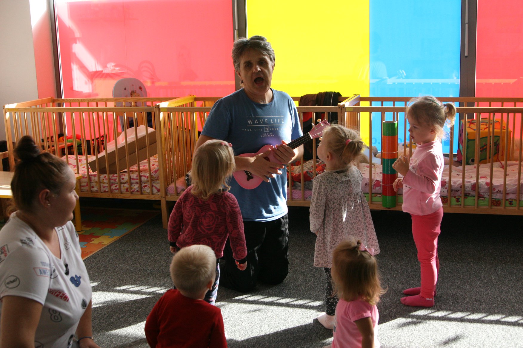 Propozycja: zdjęcie lekcji próbnej lub sytuacji, w której prowadzący śpiewa do dzieci na żywo.